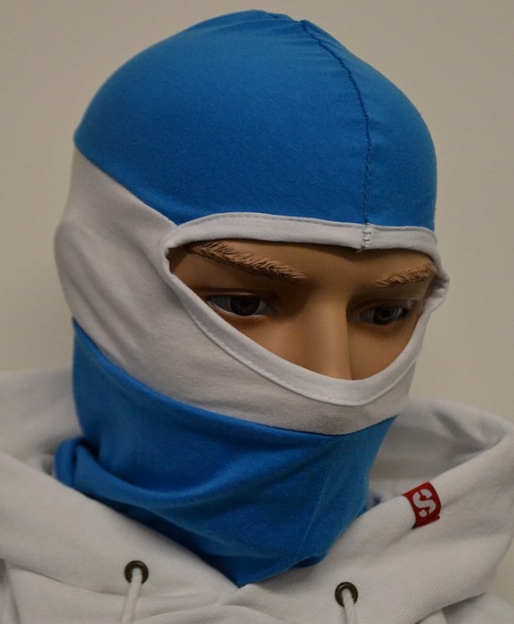 Bavlněná kukla dvoubarevná (azurově-bílá) pro všechny dobrodruhy, kteří kašlou na nějaké zákazy zahalování obličeje. Díky materiálu se dá použít i v teplých dnech.