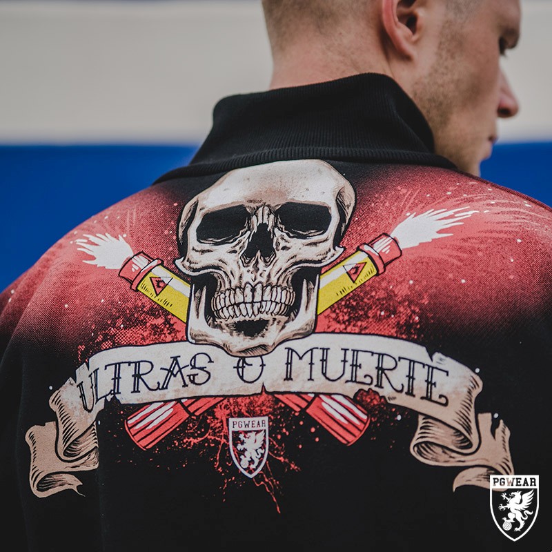 Ultras až do smrti! Mikina na zip značky PGWEAR vyrobena z vysoce kvalitní bavlny s potiskem formou kvalitního sítotisku. Na fotografii je mikina velikosti XL focená na muži vysokém 187 cm.
