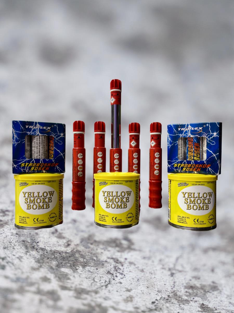 Balíček obsahuje celkem 6 kusů bílých stroboskopů, které blikají cca 90 vteřin, 5 kusů mořských teleskopických světlic Ultra Red a 3 kusy dýmovnic Smoke Bomb žluté barvy. Jedná se o pyrotechniku kategorie P1, kterou si mohou objednat pouze nakupující starší 18 let. Světlice hoří přibližně minutu.